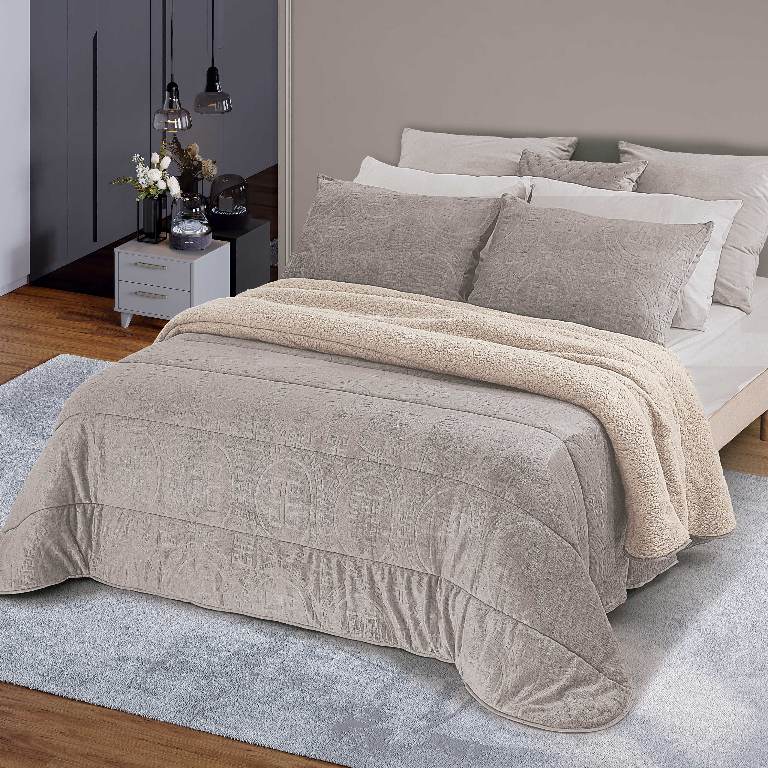 Com um padrão simples e moderno é complementada com um reverso em "pêlo de borrego".