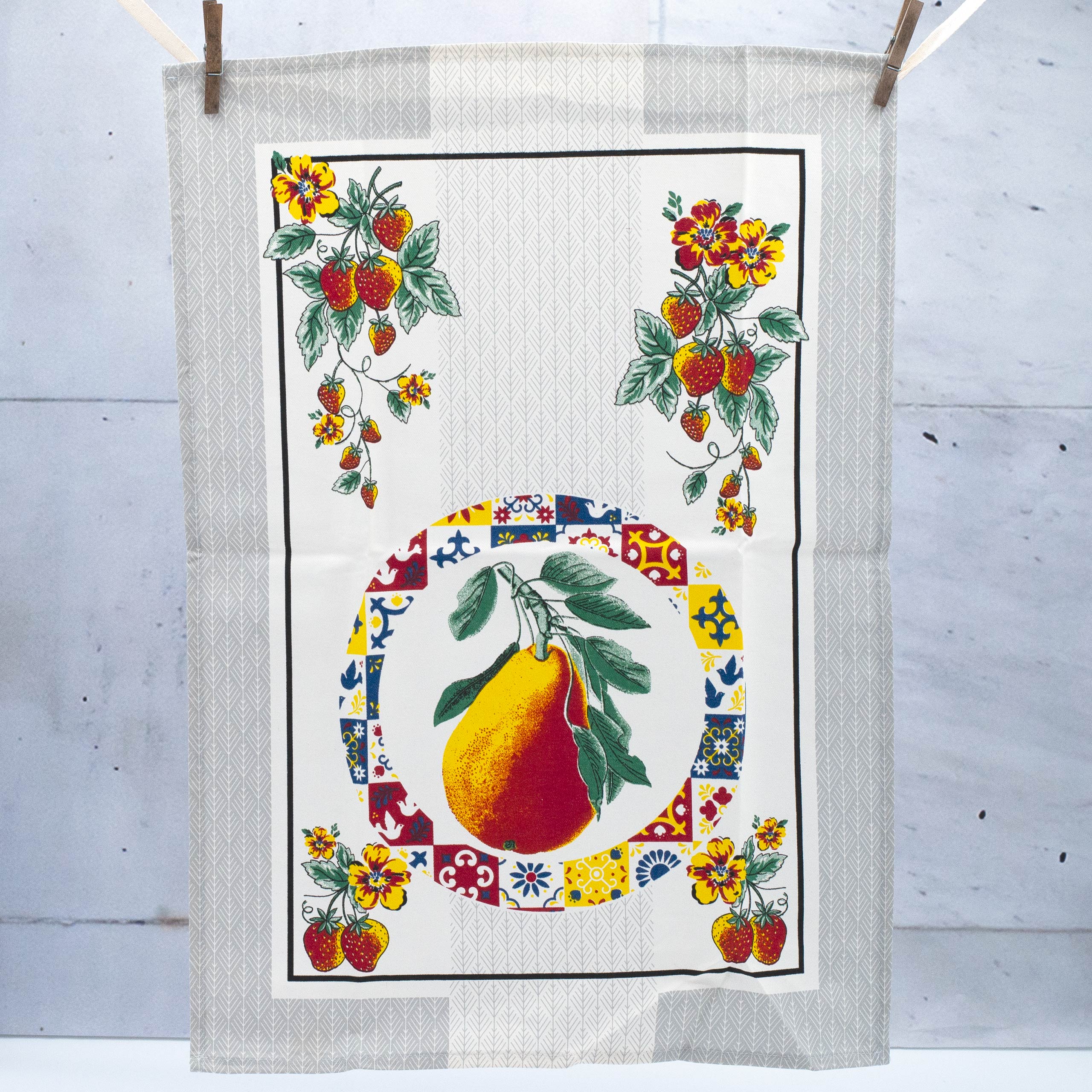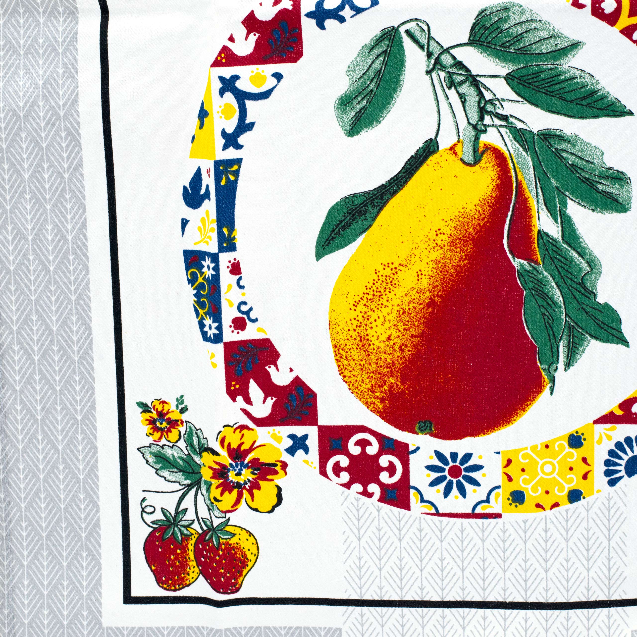 Pano de cozinha estampado em sarja, 100% algodão, com padrões pitorescos que alegram qualquer cozinha.